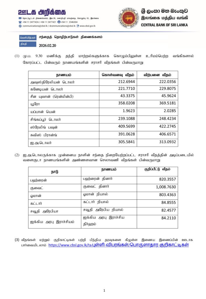 அதன்படி, ஏனைய வெளிநாட்டு நாணய மாற்று விகிதங்கள் தொடர்பாக இன்று (20.02.2026) மத்திய வங்கியினால் வெளியிடப்பட்டுள்ள தகவல்கள் கீழே தரப்பட்டுள்ளது.