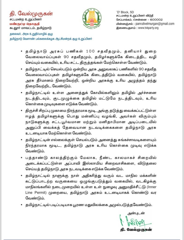 தமிழக வாழ்வுரிமைக் கட்சியின் நீண்ட நாள் கோரிக்கைகளான, கீழ்காணும் கோரிக்கைகளை நிறைவேற்றிட, தமிழ்நாடு அரசின் சார்பில் உரிய நடவடிக்கைகளை மேற்கொள்ள வேண்டும் என்று தங்களை அன்புடன் கேட்டுக்கொள்கிறேன்.