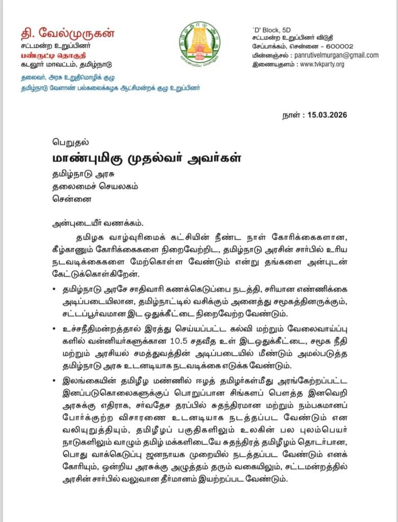 தமிழ்நாடு அரசே சாதிவாரி கணக்கெடுப்பை நடத்தி, சரியான எண்ணிக்கை அடிப்படையிலான, தமிழ்நாட்டில் வசிக்கும் அனைத்து சமூகத்தினருக்கும், சட்டப்பூர்வமான இட ஒதுக்கீட்டை நிறைவேற்ற வேண்டும்.